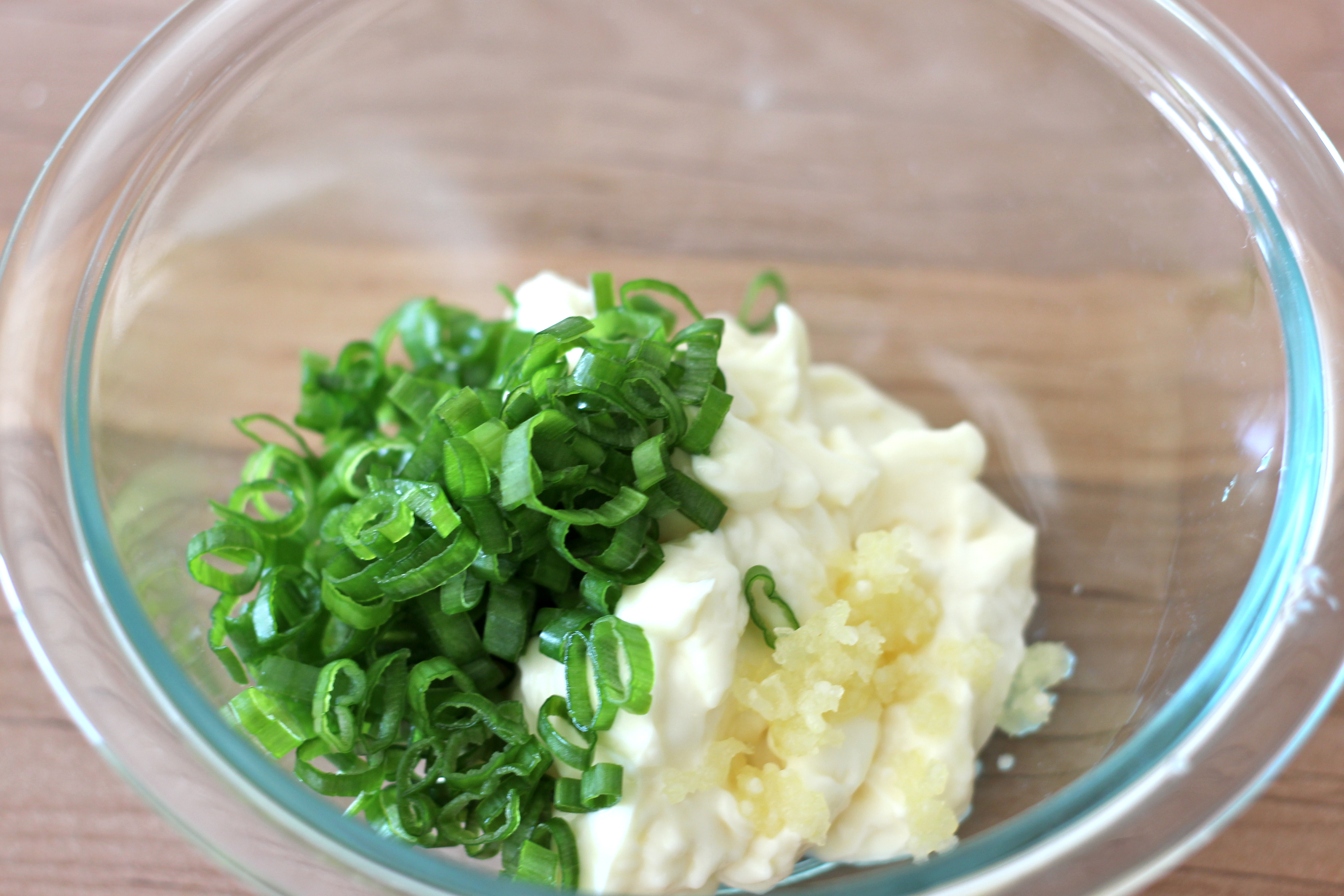 and make the green onion mayo, which is the most difficult task ever. You take some mayo and combine it with green onion and garlic. So hard, right?