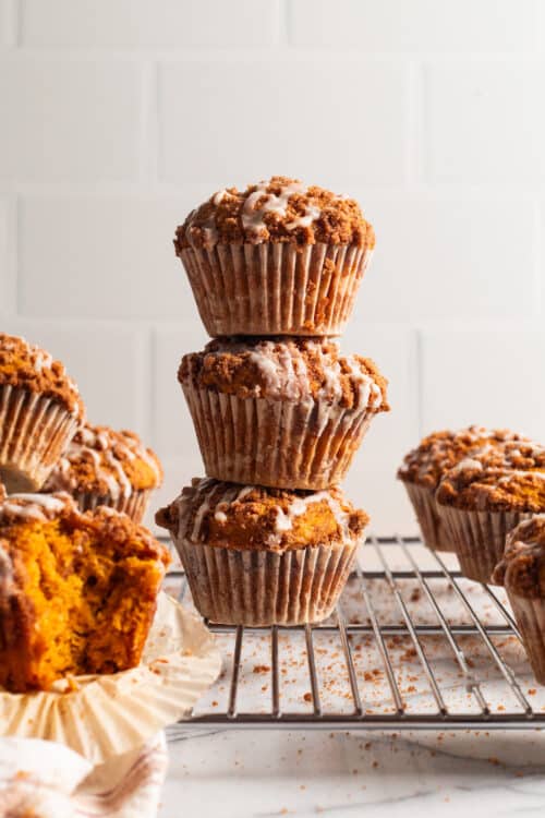 THE BEST pumpkin muffins with an oh-so-crumbly streusel topped with a drizzled vanilla glaze! So moist, so fluffy!