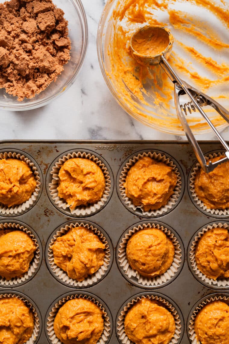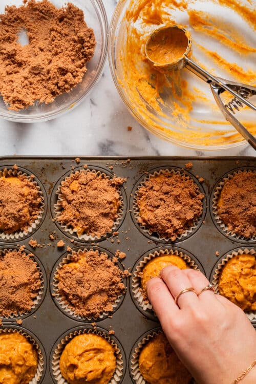 - Scoop the batter evenly into the muffin tray. Sprinkle with reserved topping, using your fingertips to gently press the crumbs into the batter.