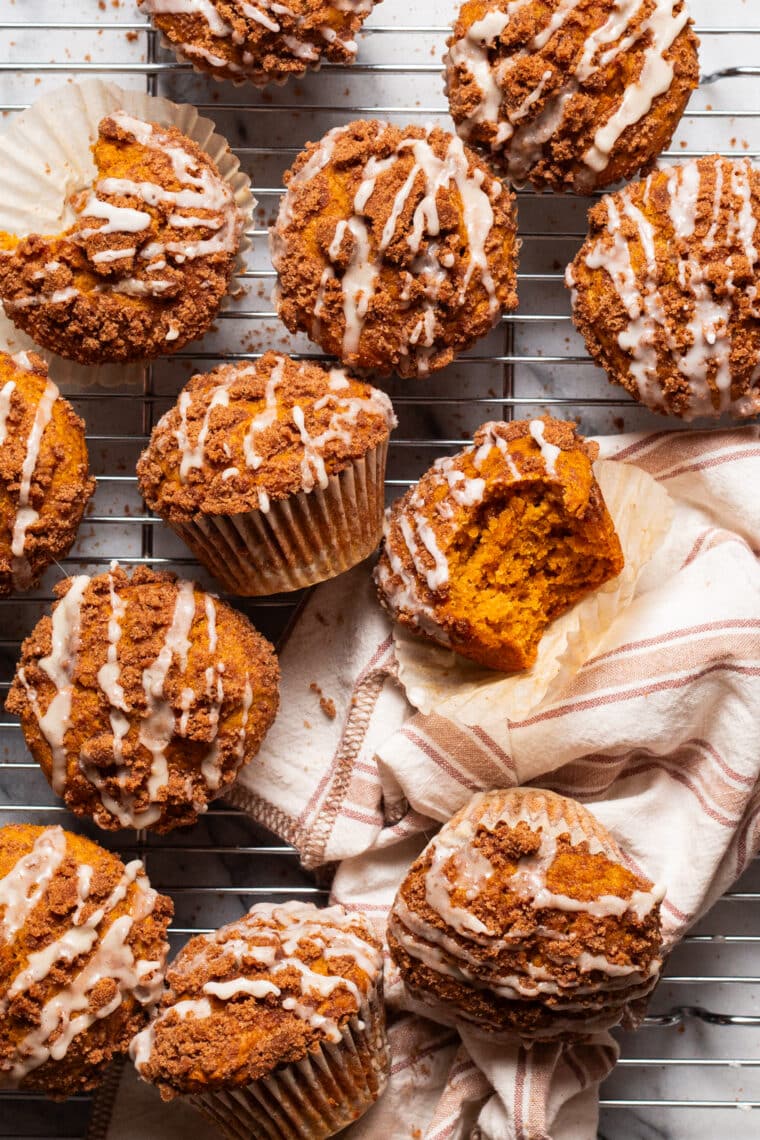 - Crumb topping. The crumbly cinnamon streusel topping combined with a drippy vanilla glaze takes these muffins over the top, making them bakery-quality.