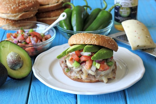 Now on to something more pleasant: burgers. No wait, burgers with jalapeño pico de gallo. And some homemade refried beans. And sliced avocado. And you can’t forget the melted jalapeño monterey jack cheese. That’s a lot of “ands” but you get my point. These burgers are packed with amazingness. And you’ll want to finish every last bite, with a cold beer of course.