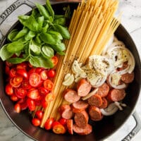 One pot pasta or one pan pasta is an easy pasta dish where the uncooked pasta cooks alongside everything else – meat, vegetables, herbs and seasonings – in a single pan. As the dish simmers, the starch from the pasta will help transform some of the leftover pasta water into the most lovely saucy consistency, coating the spaghetti so perfectly.