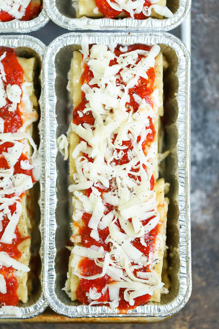 - Spread 1/4 cup tomato mixture onto the bottom of 6 8″ foil disposable aluminum loaf pans. Add 4 roll ups per pan; top with remaining tomato mixture and sprinkle with mozzarella and Parmesan.*