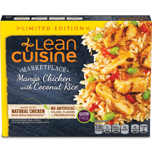 Canned mango and mango nectar can be found in the Asian or Mexican grocery section. I saw the Lean Cuisine add and want to have it for dinner. The picture on the box shows edememe, which I plan to add to mine to incorporate a veggie in this dish. Snow peas would be a good addition.