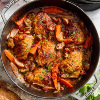 I have tried many of your recipes and they never fail to impress! Thank you for this delicious warm supper for a cool autumn day. 🙂 I actually added a bit more thyme because we love it. Also, because I had more chicken stock available, I used it in place of the milk and just added a little cream after the thickening step. I did make the biscuits and added them as per the recipe. I had to cook a little longer, but that may be my oven.