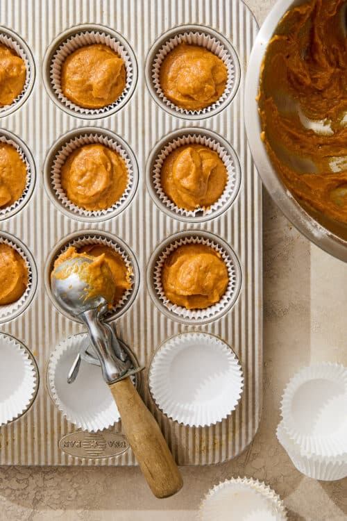 Use a large cookie scoop to scoop the batter into each well to ensure a consistent size and even baking for each muffin.