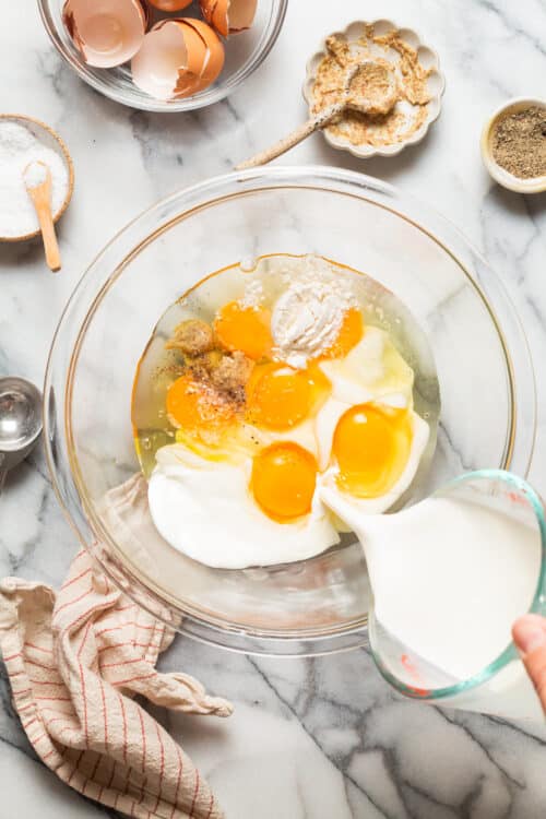 - Make the custard. Mix together the eggs and dairy choice (milk, half and half or heavy cream), precooking any fillings, if needed.