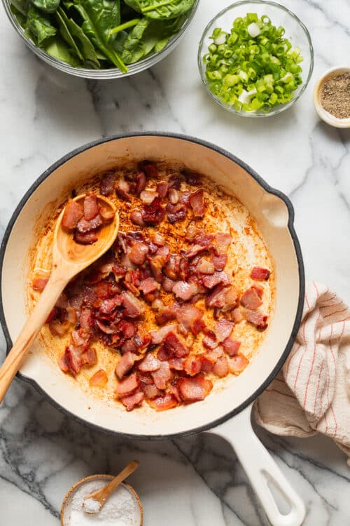 - Heat a large cast iron skillet over medium high heat. Add bacon and cook until brown and crispy, about 6-8 minutes. Drain excess fat, reserving 1 tablespoon in the skillet; transfer bacon to a paper towel-lined plate.