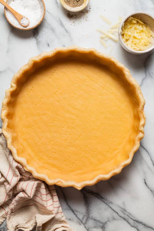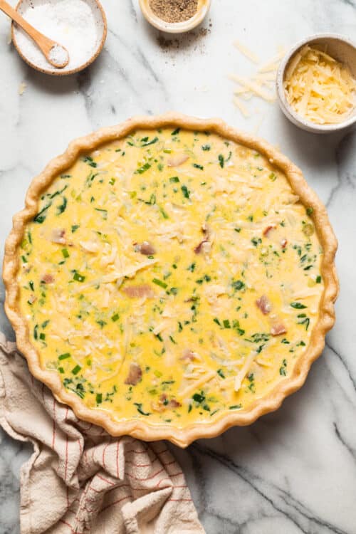 Yes! The quiche crust can be blind baked up to 2 days in advance, covered tightly and stored at room temperature, or the quiche can be assembled and baked up to 2 days in advance and stored in the fridge, serving at room temperature or reheating at 300°F until warmed through.