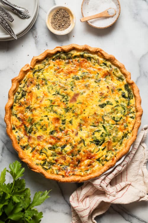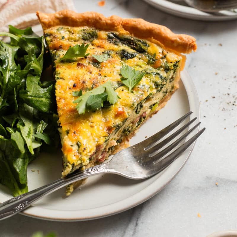 Bacon and spinach is a classic quiche filling combination, but various meat and vegetable options can also be added or swapped out as needed.