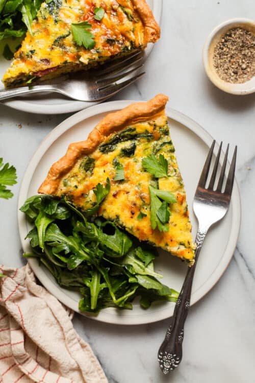 When serving warm, allow the quiche to cool for at least 10 minutes to let the custard set. This will allow the quiche to cut and serve easily with clean slices throughout.