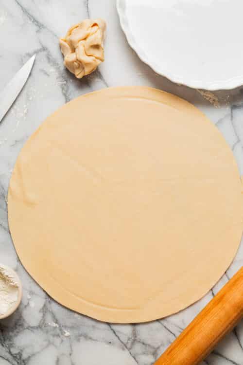 - Unroll both pie doughs on a lightly floured surface. Brush 1 pie dough lightly with 1 1/2 teaspoons water. Place remaining pie dough on top, rolling to a 15-inch circle.