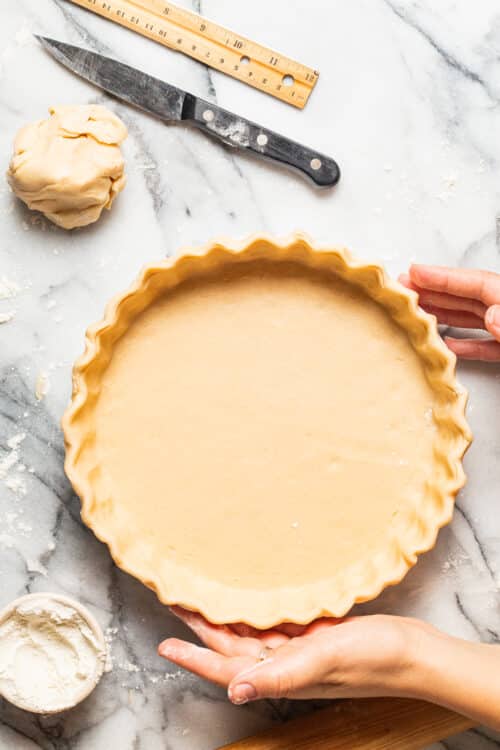 Store-bought pie dough sizes seem to keep shrinking these days so this recipe calls for 1 package of premade pie crust, utilizing both pie crusts. This allows for more leeway and running room for a prettier crimped edge to fit into a slightly larger quiche dish.